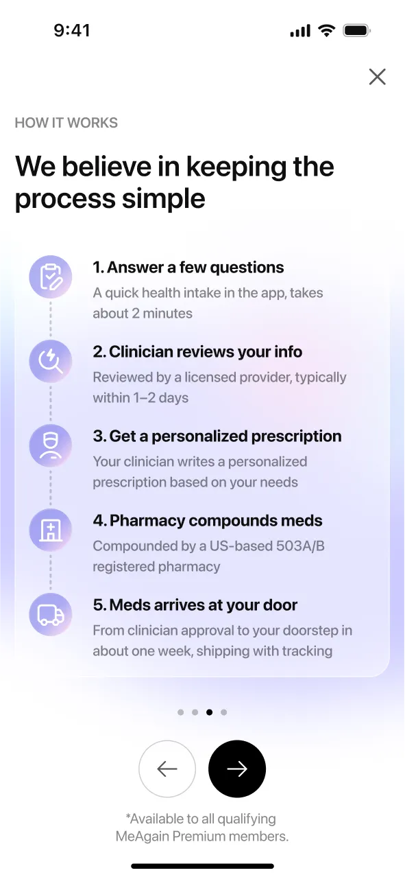 MeAgain makes money from the app subscription, not from medication markup. That's why the same flat price applies at every dose, and any savings as we grow are passed on directly to subscribers. Everything is billed month to month with cancel-anytime flexibility, while Fridays lowers the monthly rate only when you choose a longer plan. Fridays earns its price by bundling coaching, labs, dietitian support, and live programming into the medication cost, and that broader program can be the right fit if you want human support built in. MeAgain is built for people who want purpose-built GLP-1 tools and a cleaner self-pay path. Whatever medication a licensed clinician chooses, the tracker works for it, and the in-app intake is available inside MeAgain for eligible subscribers.