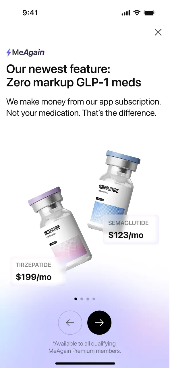 We make money from our monthly app subscription. That's it. That is why MeAgain can keep compounded semaglutide and compounded tirzepatide on flat pricing, with any savings as MeAgain grows passed on directly to subscribers. Month-to-month, cancel anytime. Hers builds its weight-loss offer around a separate monthly Hers fee plus medication billed separately, so the recurring compounded semaglutide total reaches $348/month after month one. Hers also offers oral and brand-name GLP-1 options that MeAgain does not, so Hers may fit better if those are your priority. MeAgain is built for people who want a stronger daily GLP-1 app, clearer self-pay math, and zero-markup compounded medication without a second telehealth fee. Whichever medication a licensed clinician chooses, the tracker works for it, and the in-app intake is available inside MeAgain for eligible subscribers.