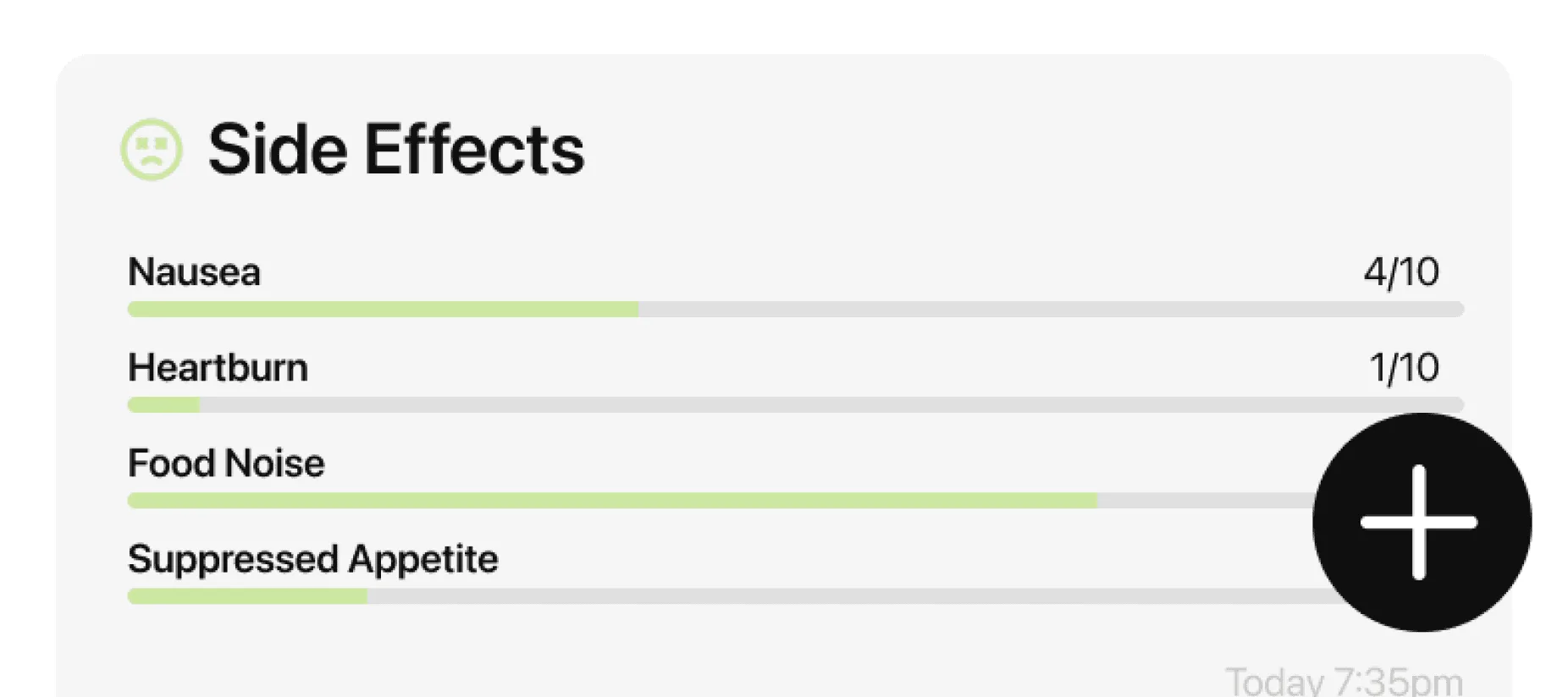 Tirzepatide side effects are most intense in the first weeks of each new dose and typically improve as your body adjusts. Log each symptom with a severity slider so you can see the actual pattern — not just whether a symptom exists, but whether it’s getting better or worse over time.